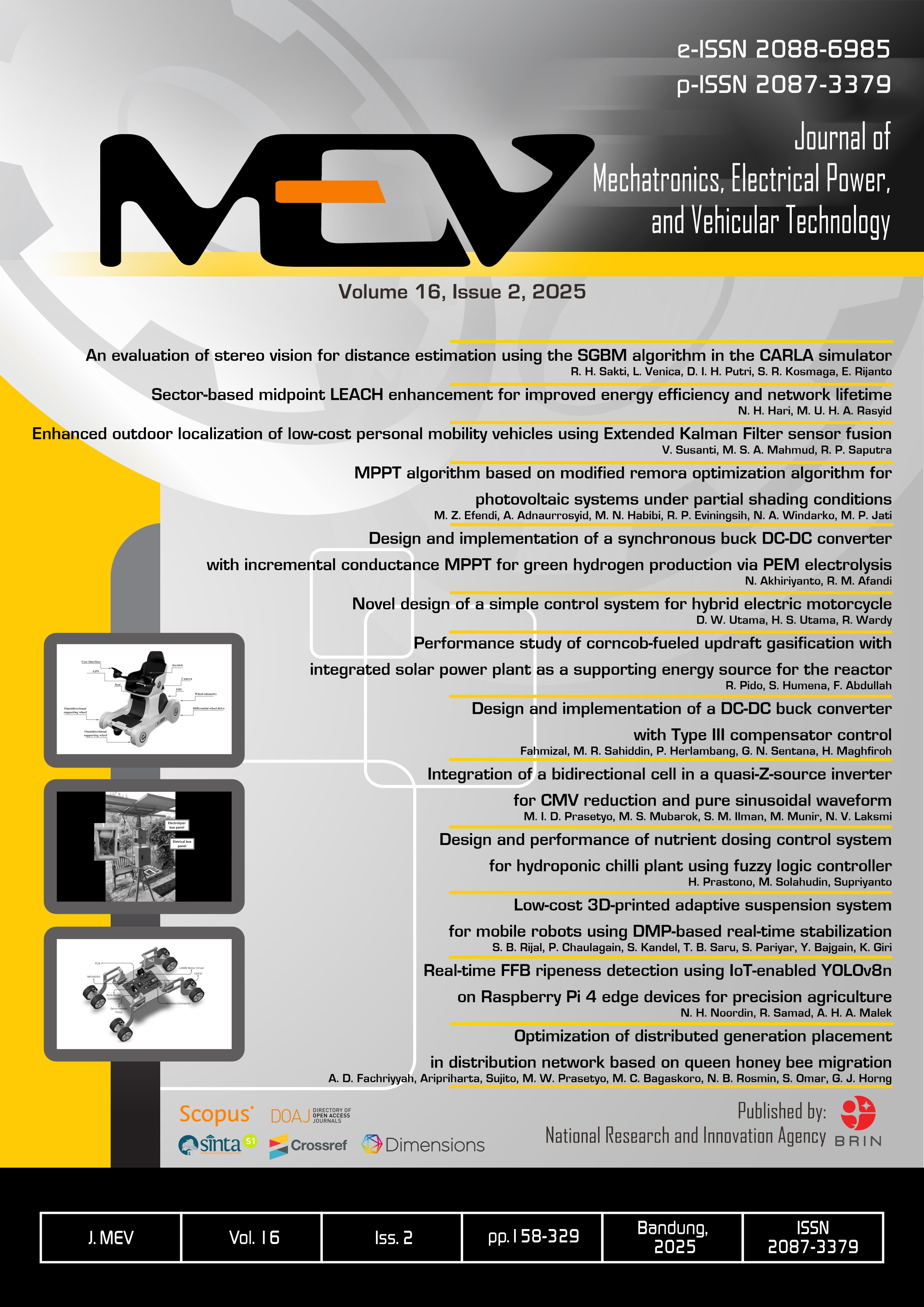 Journal of Mechatronics, Electrical Power, and Vehicular Technology (hence MEV) is an international journal providing authoritative source of scientific information for researchers and engineers in academia, research institutions, government agencies, and industries. We publish original research papers, review articles and case studies focused on mechatronics, electrical power, and vehicular technology as well as related topics. All papers are peer-reviewed by at least two referees. MEV is published and imprinted by National Research and Innovation Agency (BRIN) - formerly Indonesian Institute of Sciences (LIPI) and managed to be issued twice in every volume. Scopus, Directory of Open Access Journal (DOAJ), Google Scholar, EBSCOHost, Sinta, Asean Citation Index, PKP Index, Indonesian Scientific Journal Database (ISJD), Indonesia One Search, Indonesian Publication Index (IPI), ROAD, etc. | ![]() |